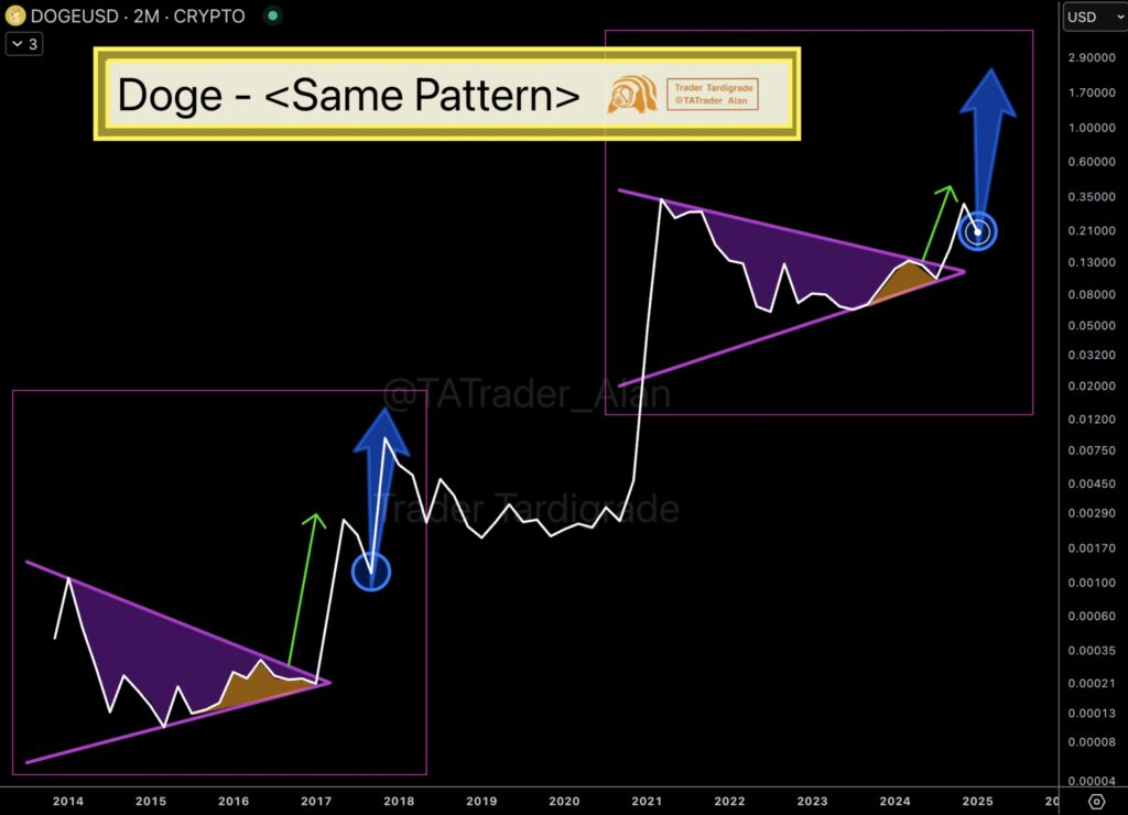 Analysis reveals a potential parallel between Dogecoin's current price action and its 2017-2018 bull run. This earlier period featured a large descending triangle (2015-2017), followed by a significant breakout rally. The price consolidated within this pattern before a parabolic surge. Similarly, DOGE appears to be forming a comparable pattern between 2021 and 2025, characterized by a descending triangle, lower highs, and compressed price action.
