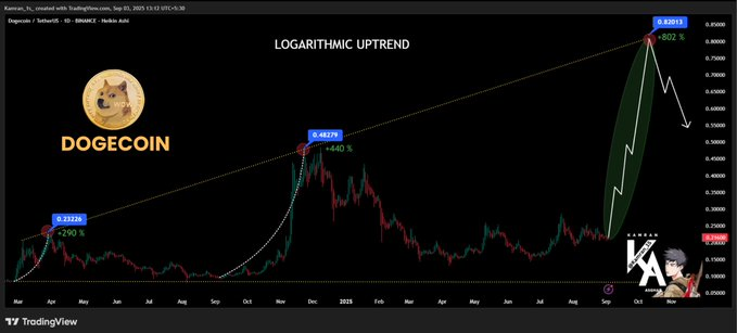Market analyst Kamran Asghar noted that Dogecoin continues to follow a logarithmic uptrend on the weekly timeframe. He observed that each impulsive wave in its history has surpassed the previous one in magnitude. This structure, he suggested, could create the setup for a strong continuation rally.