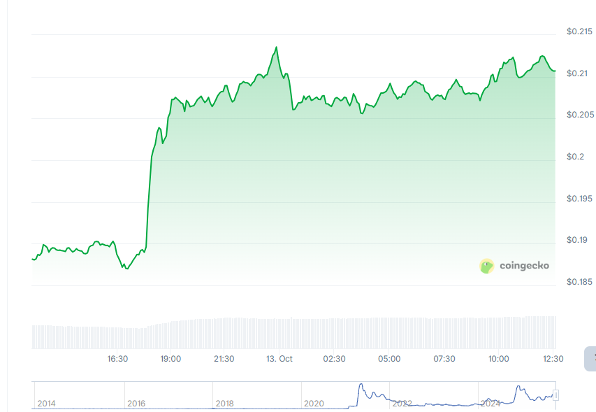 The price range between $0.187 and $0.2136 over the same period reflects a decisive breakout from prior consolidation. Volume expansion during the rise signals renewed accumulation and stronger market participation. This indicates that the speculative and institutional traders might be returning to the asset after weeks of subdued volatility.