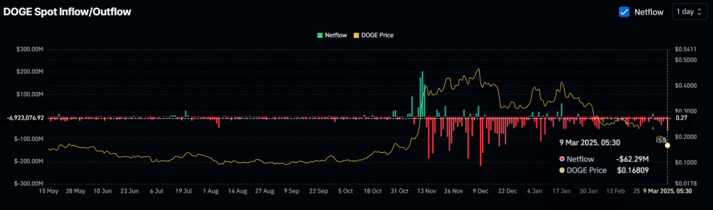 Beyond the whale's accumulation, data from Coinglass shows $63 million worth of DOGE moved off exchanges in the last 24 hours, indicating potential accumulation by long-term holders and investors.