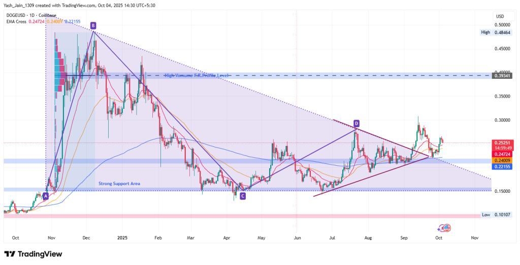 Dogecoin surged to $0.263 after bouncing from strong support in late September. Much of the optimism is tied to the SEC’s upcoming decision on DOGE ETFs filed by Grayscale and Bitwise. Approval could spark institutional inflows, pushing Dogecoin closer to $0.30 and beyond.