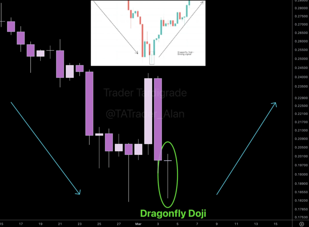 Recent Dogecoin (DOGE) price action shows a Dragonfly Doji forming on the daily chart, potentially signaling a reversal of the current downtrend. At the time of writing, DOGE was trading at $0.19, with the $0.20 level acting as a potential support.