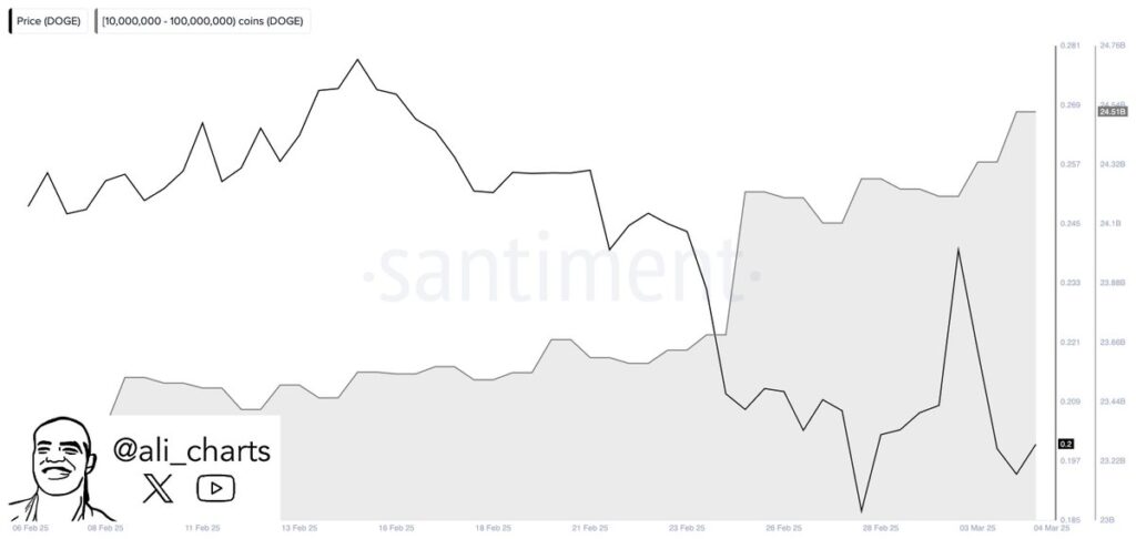 Recent Dogecoin news highlights a significant increase in DOGE holdings by whales, with approximately 180 million DOGE accumulated over the last 24 hours. This accumulation is reflected in distinct peaks on the trading volume chart, showing periods of heavy buying activity. The most pronounced peak occurred between the end of February and the beginning of March.
