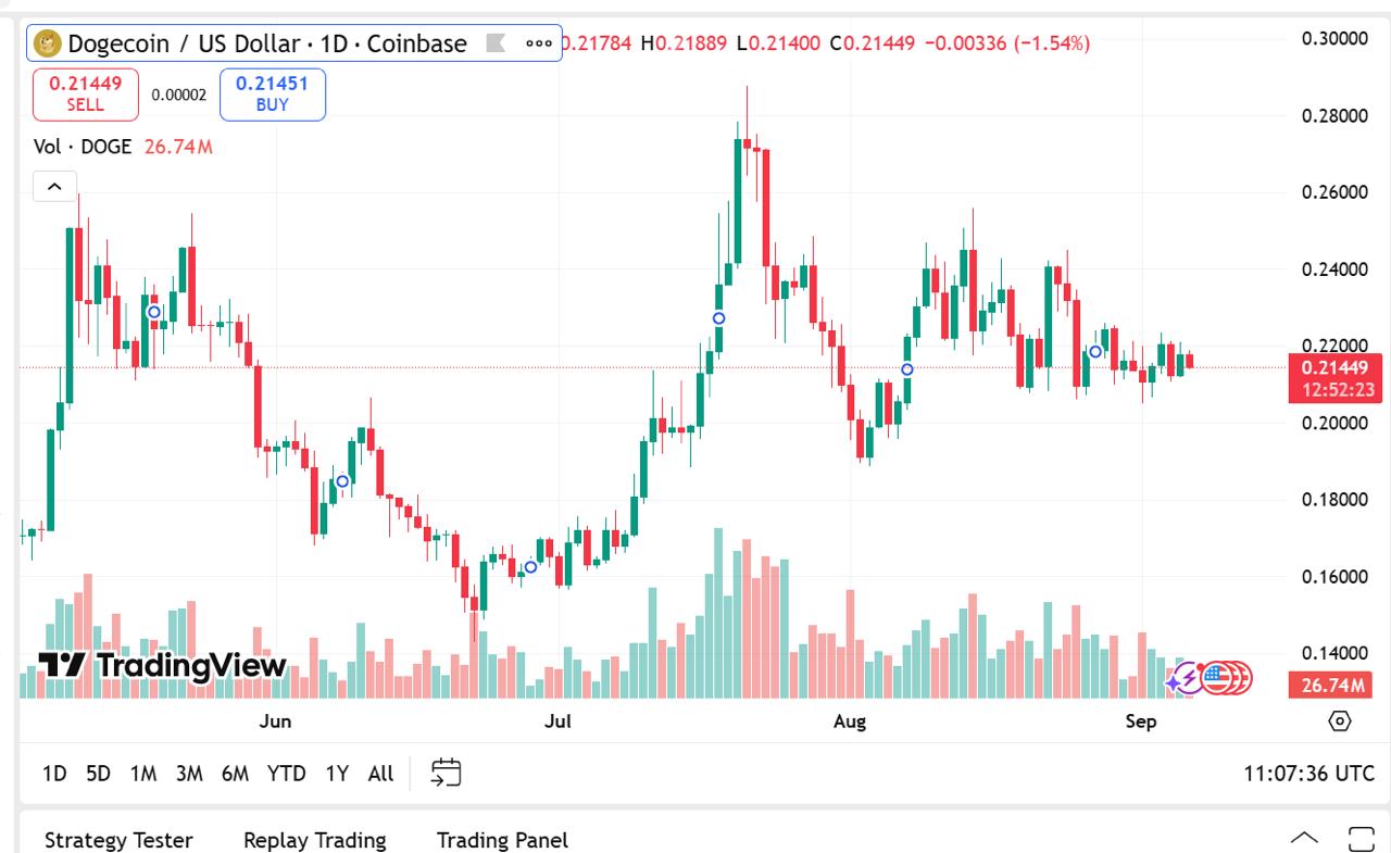 Dogecoin trades at $0.2144, losing 1.13% of value in the last day, with a market cap of $32.34 billion. Its trading volume hit $2.2 billion, increasing by 38.4%.