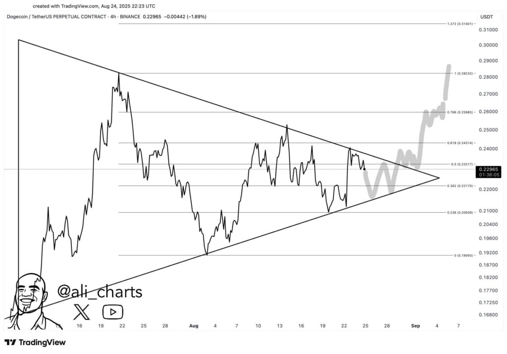 - Dogecoin trades at $0.22965 within a tightening triangle, with analysts eyeing a decisive breakout in early September.