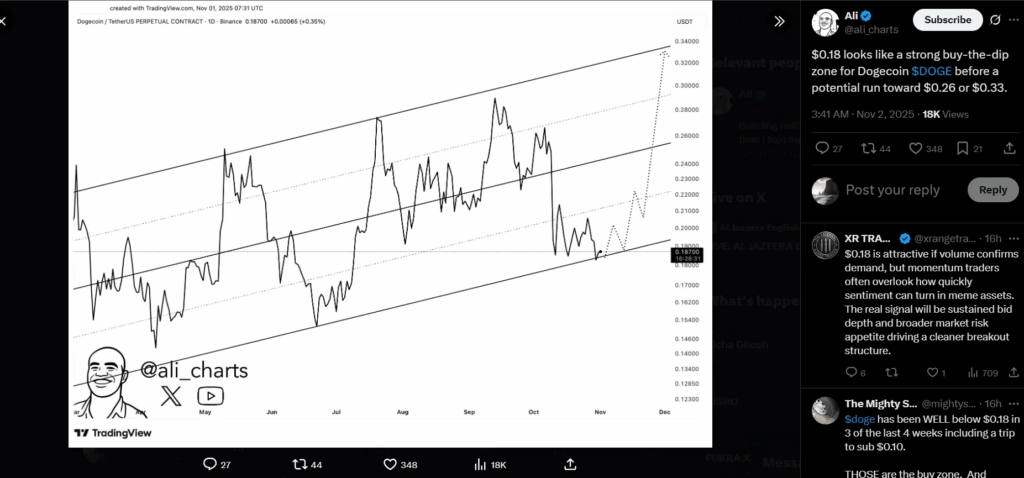 Crypto trader Ali_Charts, noted in a widely read X post that $0.18 looked like a ‘strong buy-the-dip zone’ before it springs to $0.26 or $0.33.