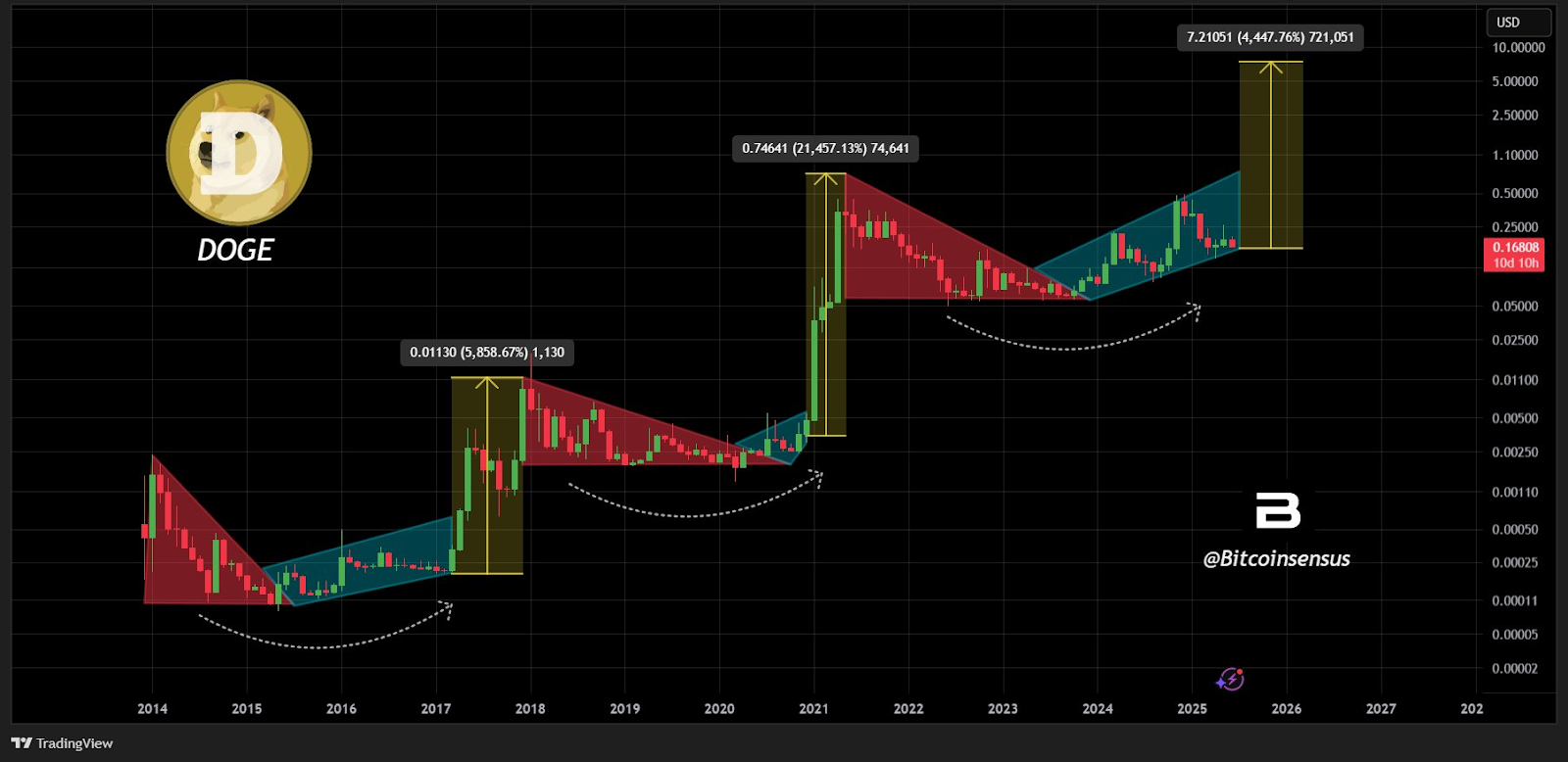 Technical analysis and past performance suggest Dogecoin could potentially reach $7.21 in its next macro cycle, representing a gain of over 4,400% from its all-time high (ATH).