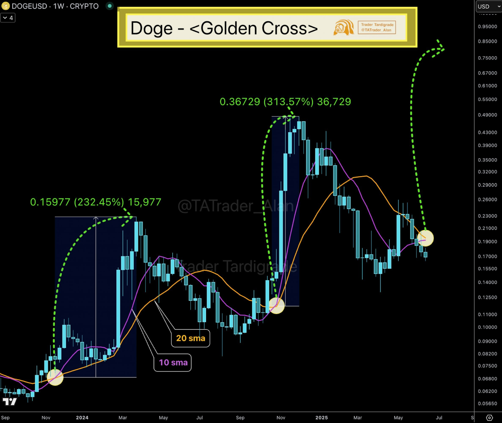 Moreover, new analysis from Tardigrade is adding to the optimistic outlook. A Golden Cross is forming on Dogecoin’s weekly chart. This formation involves the 10-week Simple Moving Average (SMA) crossing above the 20-week SMA. Historically, this signal has preceded significant rallies for DOGE. For example, in late 2023, Dogecoin rose from $0.06 to $0.229, a 232% increase. Another Golden Cross in October 2024 saw DOGE climb from $0.10 to $0.48, gaining 313%.