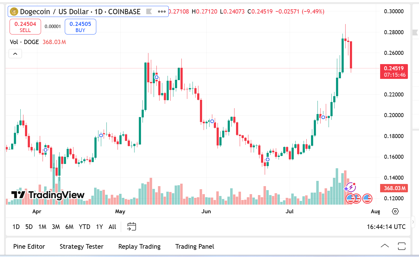 Speculation surrounding Dogecoin has intensified following a recent analyst prediction that forecasts a $1 price target. Currently trading around $0.2483, Dogecoin has experienced some volatility, losing 6.93% in the last 24 hours. Its market capitalization stands at $37.18 billion, with a 24-hour trading volume of $3.69 billion, representing a substantial decrease of 31.79%.