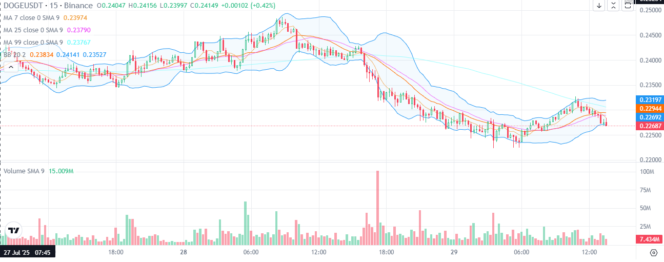 Towards the end of July 29th, Dogecoin began to recover some of its previous losses. The price stabilized and attempted to retest the MA 99 line, which currently acts as a resistance level. Consistent volume during this move implies increased buyer interest at the lower price points.