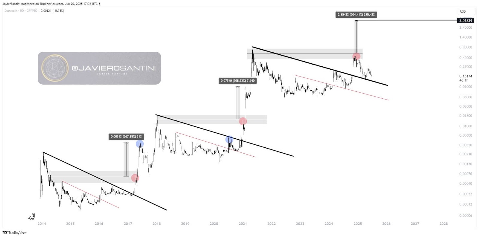 Further analysis highlights Dogecoin's tendency to compress under a diagonal trendline before experiencing significant breakouts. Historically, each breakout has resulted in rallies exceeding 9,000%, based on past cycle data.