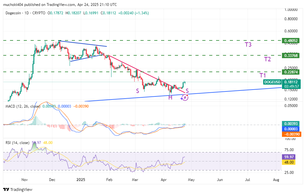 Daily chart analysis reveals a reversal pattern, featuring an inverse head and shoulders formation alongside a bullish divergence in the Relative Strength Index (RSI). The daily Moving Average Convergence Divergence (MACD) line is nearing a bullish crossover, indicating growing buyer control.