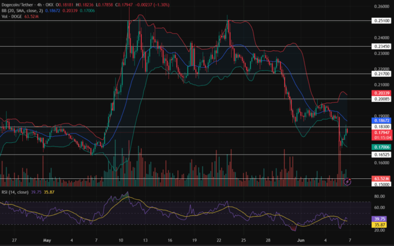 Bollinger Bands (BB) on the 4-hour timeframe indicate heightened volatility, as evidenced by their widening. The DOGE price recently tested the lower band near $0.17, suggesting significant selling pressure. The price has since recovered and is approaching the midline.