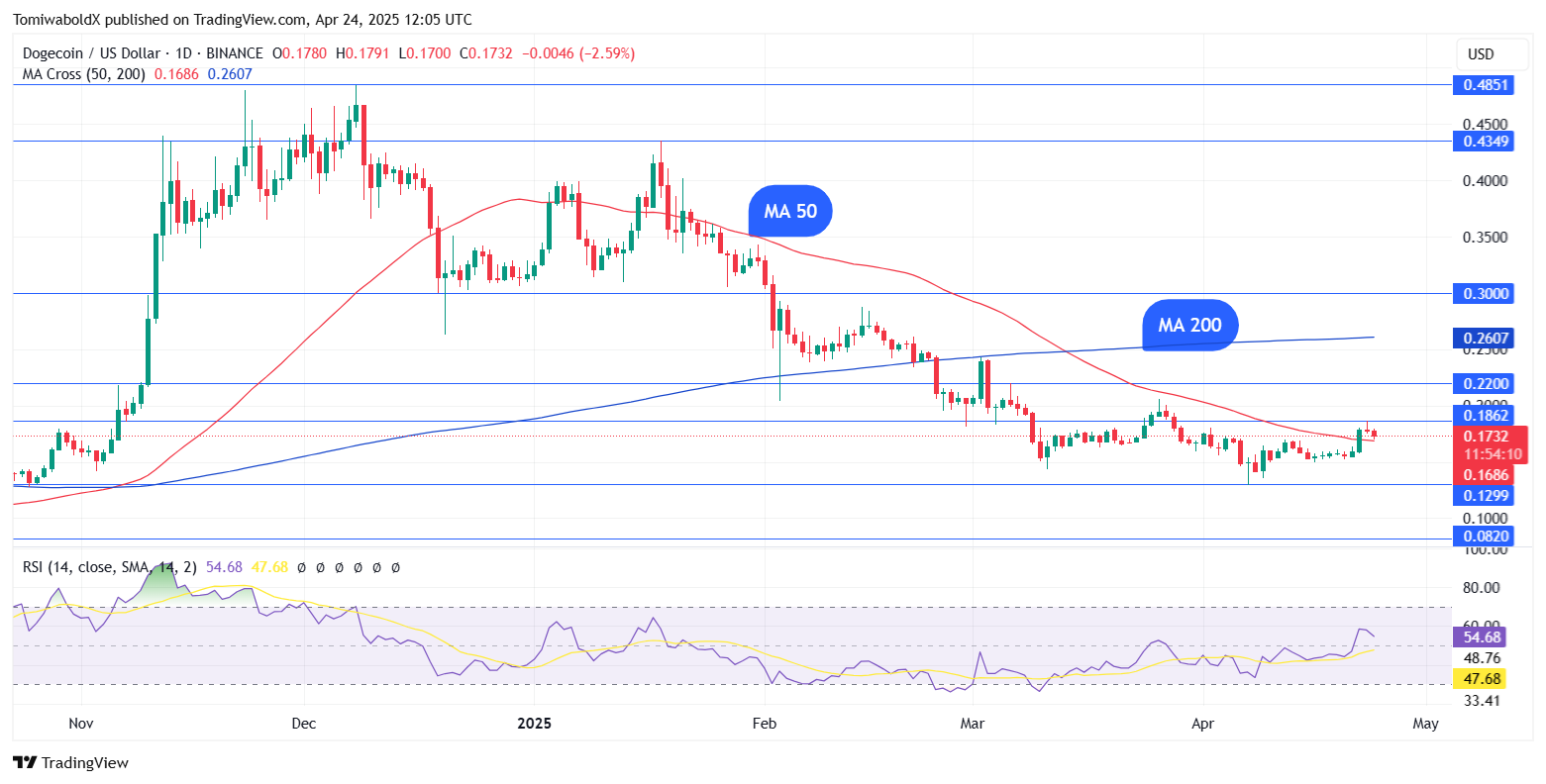 Following two consecutive days of gains earlier this week, Dogecoin surpassed its 50-day Simple Moving Average (SMA), a resistance level since December 2024, reaching highs of $0.1855 on Wednesday.