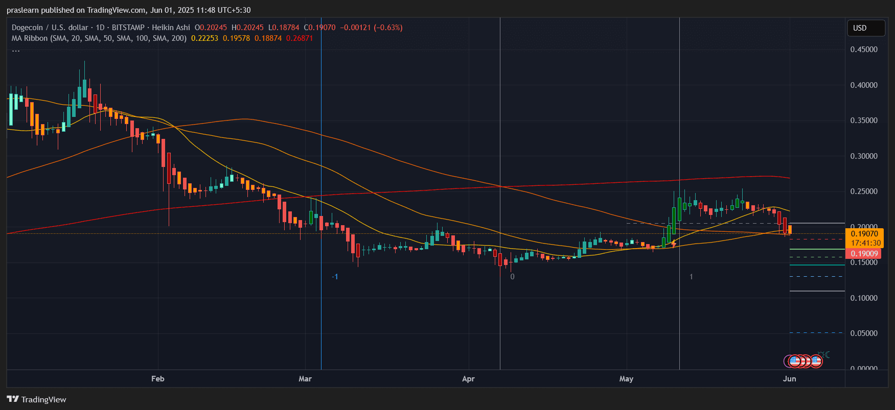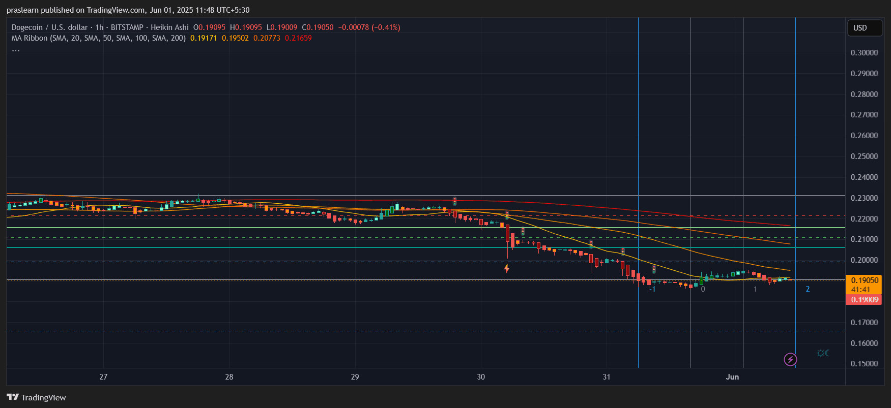 The hourly chart reinforces the bearish sentiment. Since May 29, DOGE has been in a consistent downtrend, forming lower highs and lower lows. The price is trading below all key moving averages (20, 50, 100, and 200 SMA), with significant resistance at $0.195 and $0.207. Short-term momentum is weak, with any intraday rallies quickly met with selling pressure.