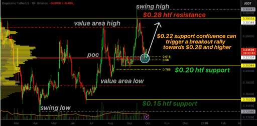 - Dogecoin has found support at $0.22, bolstered by the point of control and 0.618 Fibonacci retracement.