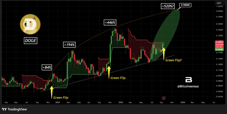 According to Bitcoinsensus, every time DOGE has broken above the Supertrend red line, the price moved higher. Recorded rallies included gains of 84%, 194%, and 446%, with the present setup described as another decision point.
