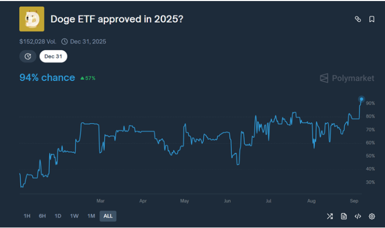 The probability of a Dogecoin ETF approval before the end of 2025 jumped from as low as 79% to 94% within the last 3 days.