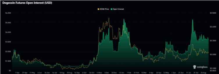 Dogecoin futures open interest hovered at $3.37 billion at the time of observation, CoinGlass data showed. This was only a slight uptick from its weekly low of around $3.25 billion, which was notably lower than levels observed in July, but still a significant improvement from its lows in June.