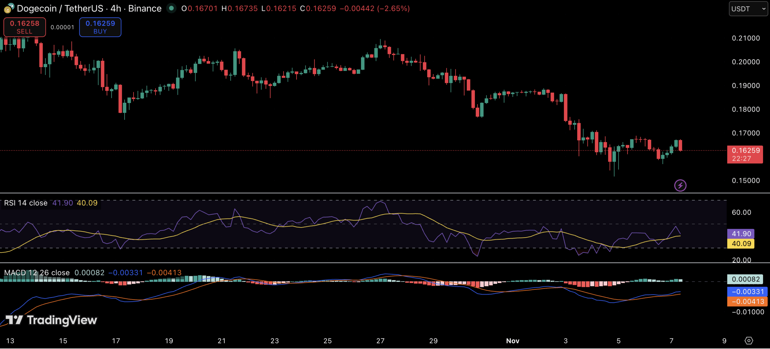 While the meme coin’s price has slipped to around $0.162, several indicators hint at stabilization. On the 4-hour chart, the RSI hovers near 42, showing moderate recovery from oversold territory, while the MACD lines are flattening, signaling weakening bearish momentum.