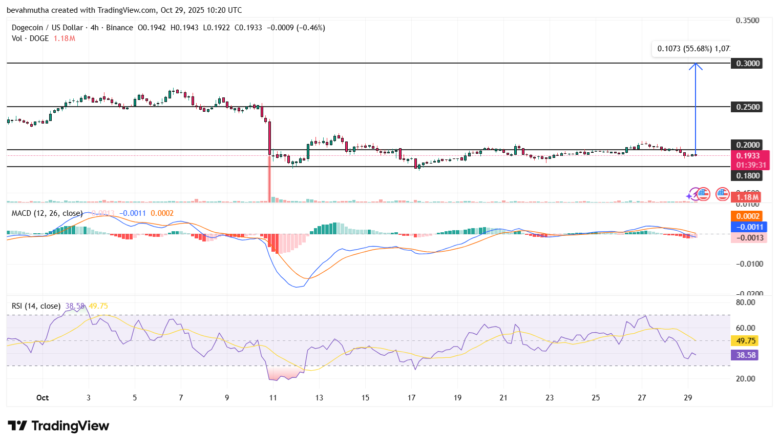 At the time of writing, the DOGE price traded near $0.193, showing slight weakness with a 0.62% decline in the past session. The chart indicates that DOGE continues to consolidate within a narrow range between $0.18 and $0.20, suggesting indecision among traders.