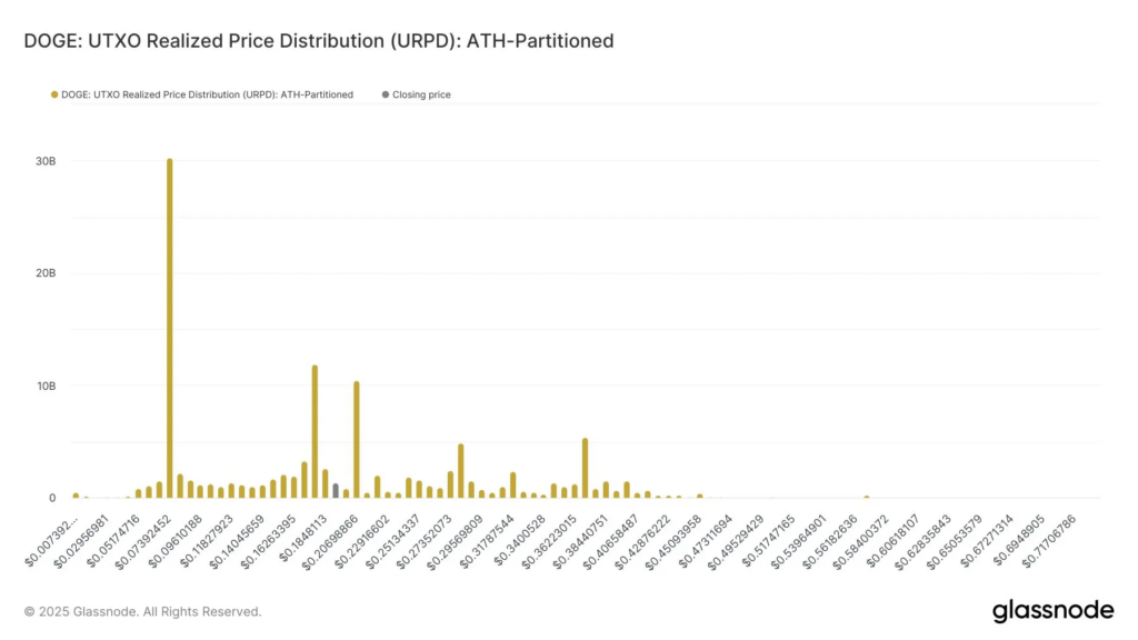 DOGE currently faces resistance at $0.20, where 7% of its supply is concentrated, according to Glassnode. This concentration, as shown by the Unrealized Price Distribution (URPD), represents a crucial decision point.