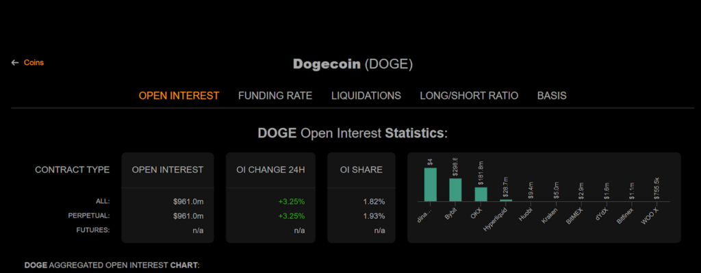 Dogecoin's open interest increased by 3.25% in the last 24 hours, reaching $961 million according to Coinalyze, indicating heightened trader engagement.