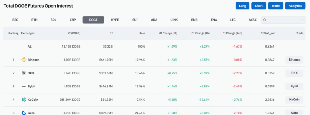 According to CoinGlass data, Dogecoin investors have locked $3.32 billion in the DOGE open interest.