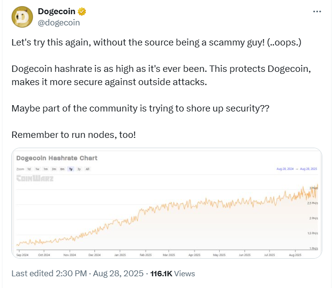 The spike in hashrate implies more miners are securing the network than ever, as pointed out by the Dogecoin official X account.