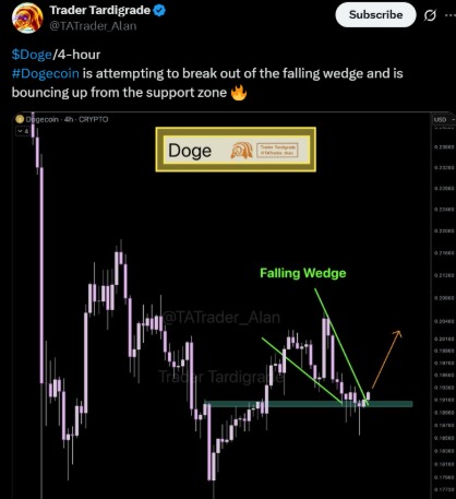 Dogecoin's price action is showing promising signs as it attempts to break out of a falling wedge pattern on the 4-hour chart. After bouncing from a key support zone, the cryptocurrency is positioning itself for a potential upward movement. If the trend continues, this could mark the beginning of a bullish rally for DOGE.