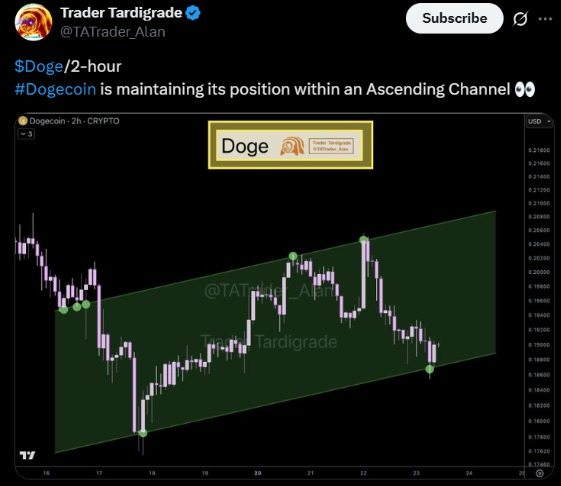 In addition to this, Dogecoin is maintaining its position within an ascending channel on the 2-hour chart. The cryptocurrency is demonstrating a steady upward trajectory, supported by higher lows and a clear price range. This technical structure indicates that Dogecoin is in a phase of consolidation with a potential for growth.