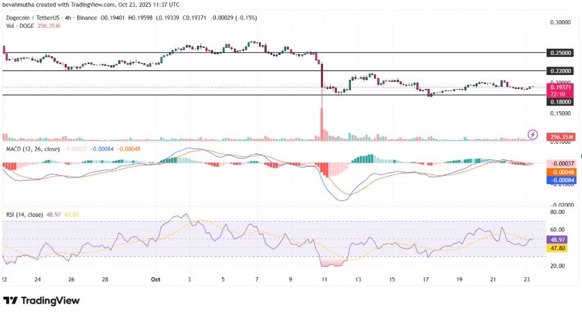 Dogecoin price remains above the $0.19 support level as bulls struggle to regain momentum. Over the past 24 hours, DOGE rose by 2% to $0.195, mirroring a broader 1.53% increase in the crypto market. The rise is attributed to factors such as institutional ETF momentum, signs of technical accumulation, and growth in the mining ecosystem, all contributing to the slight recovery seen in Dogecoin's price action.