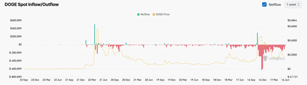 Despite recent price fluctuations, Dogecoin has demonstrated potential bullish momentum, driven by substantial exchange outflows. Data from CoinGlass reveals that over $5 billion worth of DOGE has been withdrawn from exchanges since November of the previous year. Notably, net outflows have surged to over $658 million since the beginning of May.