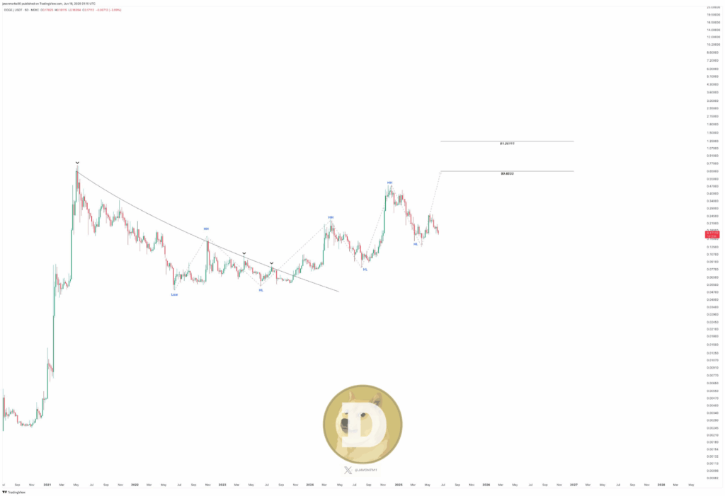 Prominent market analyst Javon Marks has projected a potential 260% surge in Dogecoin's price, potentially reaching $1.25 from its current level of $0.1700. This optimistic forecast is predicated on the observation of a falling wedge pattern, a technical formation that often suggests an impending breakout.