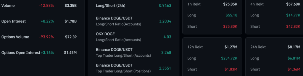 Furthermore, open interest in Dogecoin futures has increased by 0.22%, reaching $1.78 billion, signaling that a greater number of traders are committing to long positions.