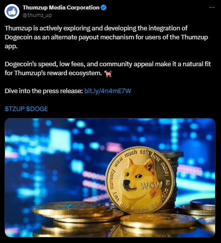 Thumzup said the use of DOGE would not replace fiat but would function as an alternative payout method.