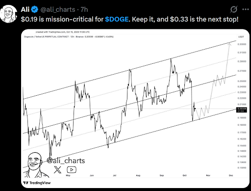 Prominent market analyst Ali Martinez said that “$0.19 is mission-critical for DOGE,” adding that maintaining this level could open the path to $0.33 in the coming weeks.