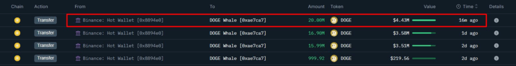 A newly created wallet that withdrew 32.9 million DOGE from the dip scooped up another 20 million DOGE worth $4.43 million from crypto exchange Binance, as per Nansen data on August 27.