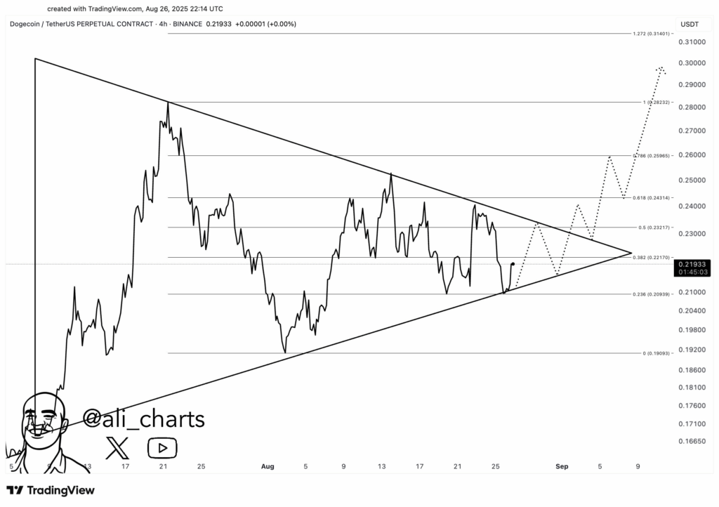 Martinez shared a 4-hour chart, noting the odds of a breakout above the symmetrical triangle pattern. He expects Dogecoin price to surpass $0.30 after the breakout.