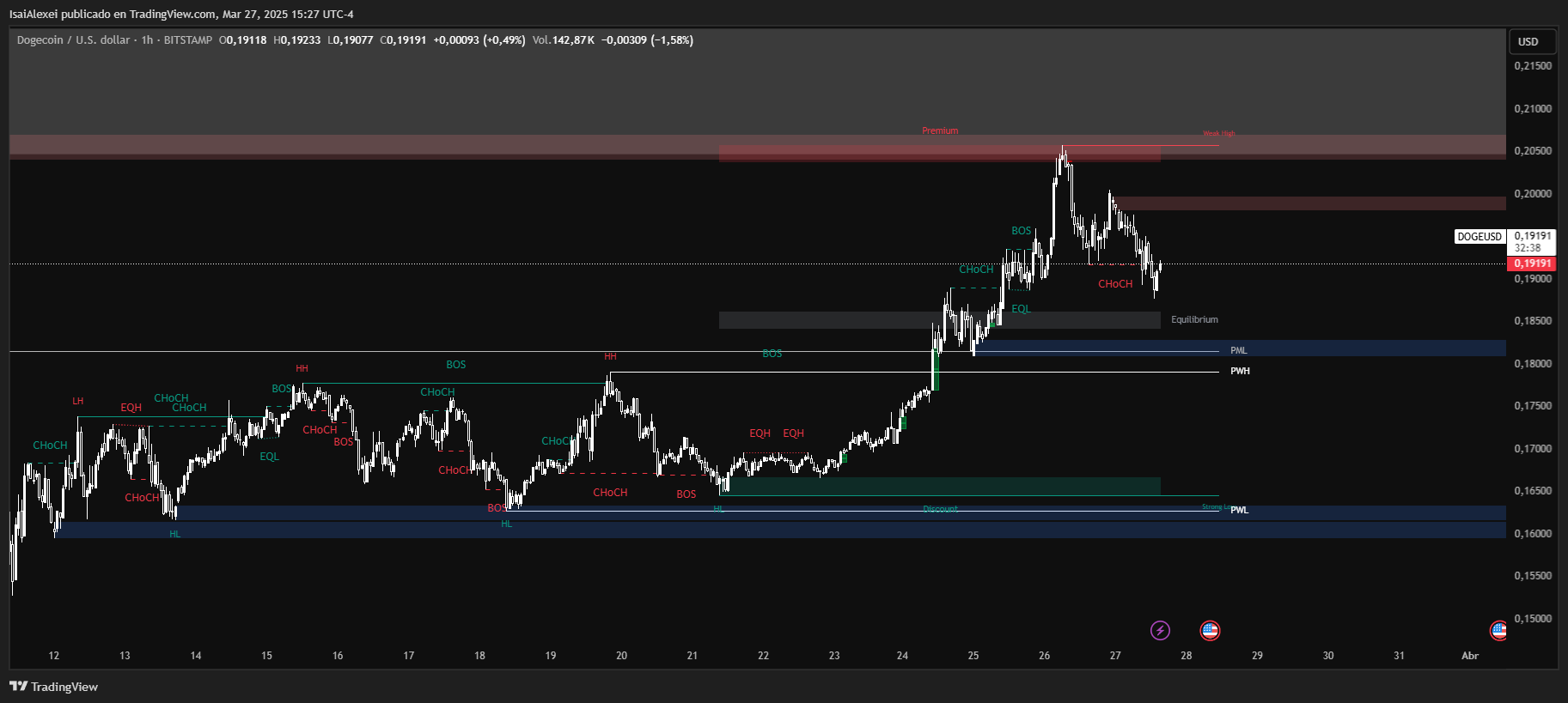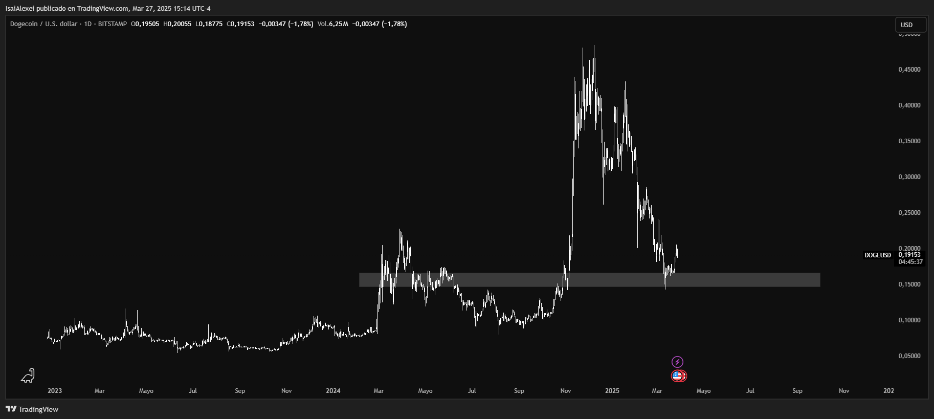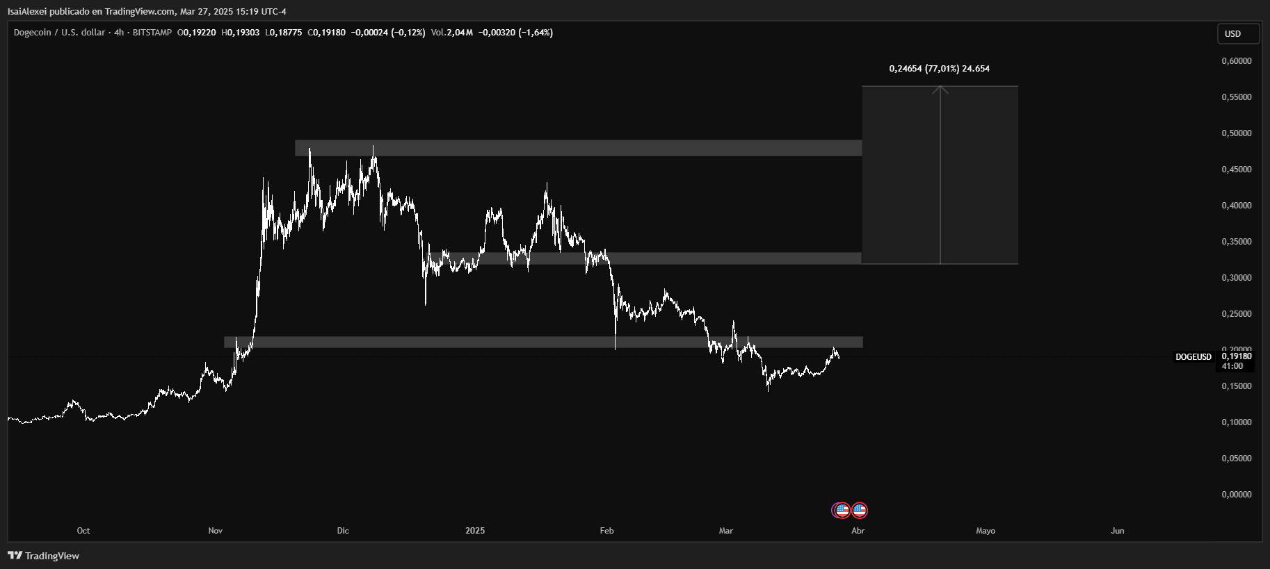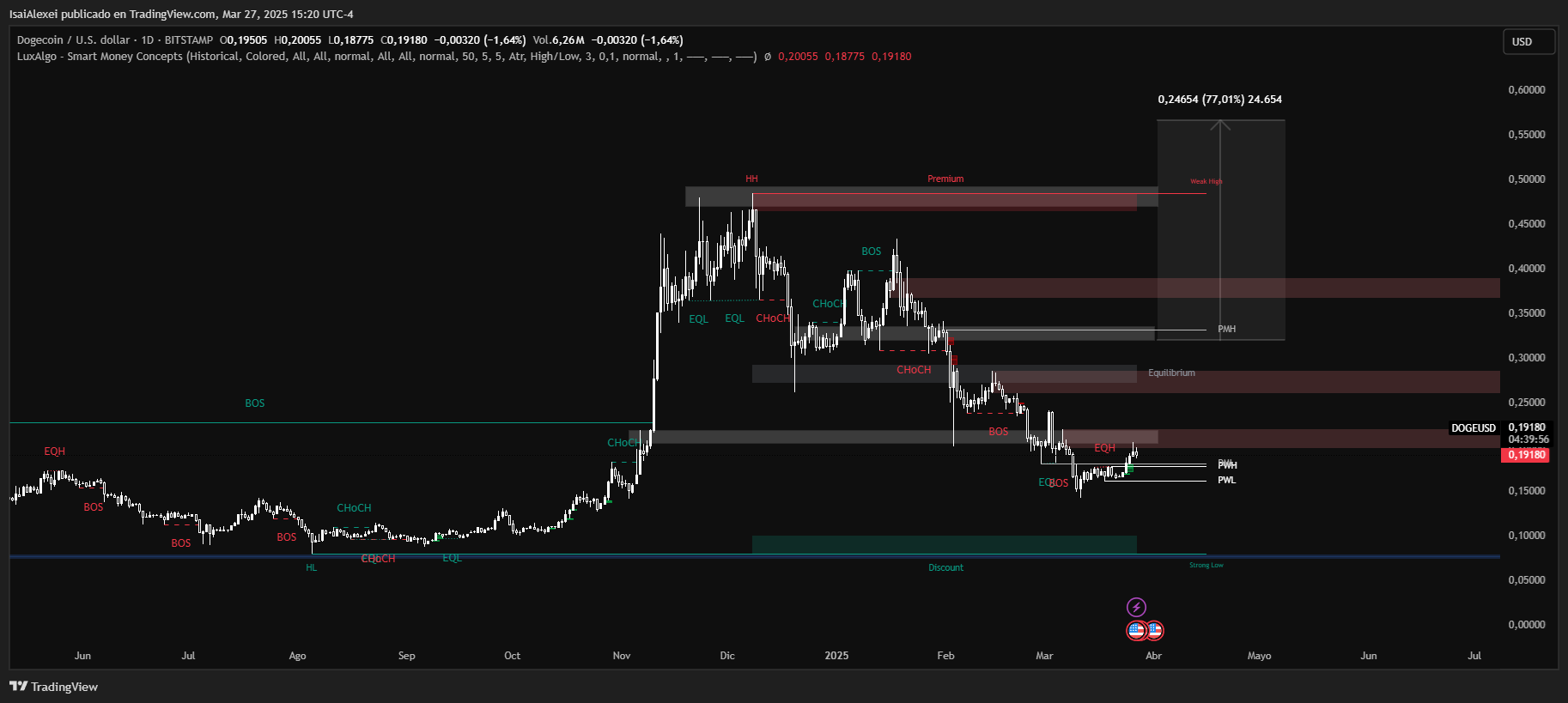 Currently, Dogecoin is struggling to maintain a price above $0.20, a significant resistance level since early March. A daily close above $0.205 would confirm the bullish structure and likely drive the price toward $0.23–$0.26, potentially extending to $0.30. Support sits at $0.187; a break below could push the price to $0.173, or even retest the $0.159 demand zone.