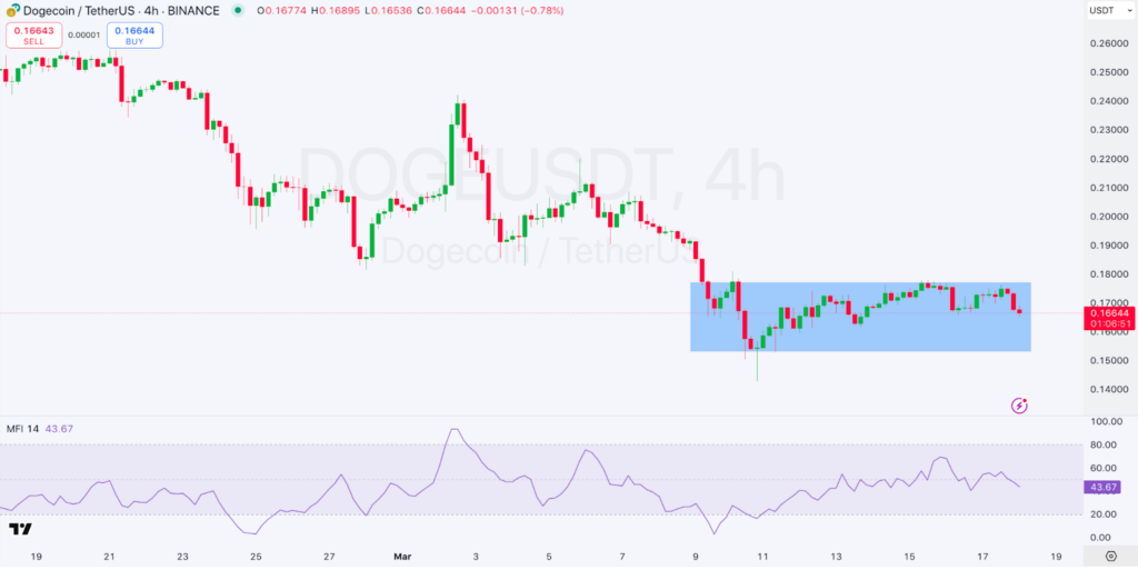 Technically, Dogecoin's short-term price action is confined to a narrow range. On the 4-hour Binance chart, DOGE is consolidating within a range of approximately $0.165 to $0.180 (visualized as a blue rectangle in the original chart). The Money Flow Index (MFI) stands at 43.6, suggesting moderate selling pressure but not yet oversold conditions. A rise in the MFI could signal a potential price reversal.