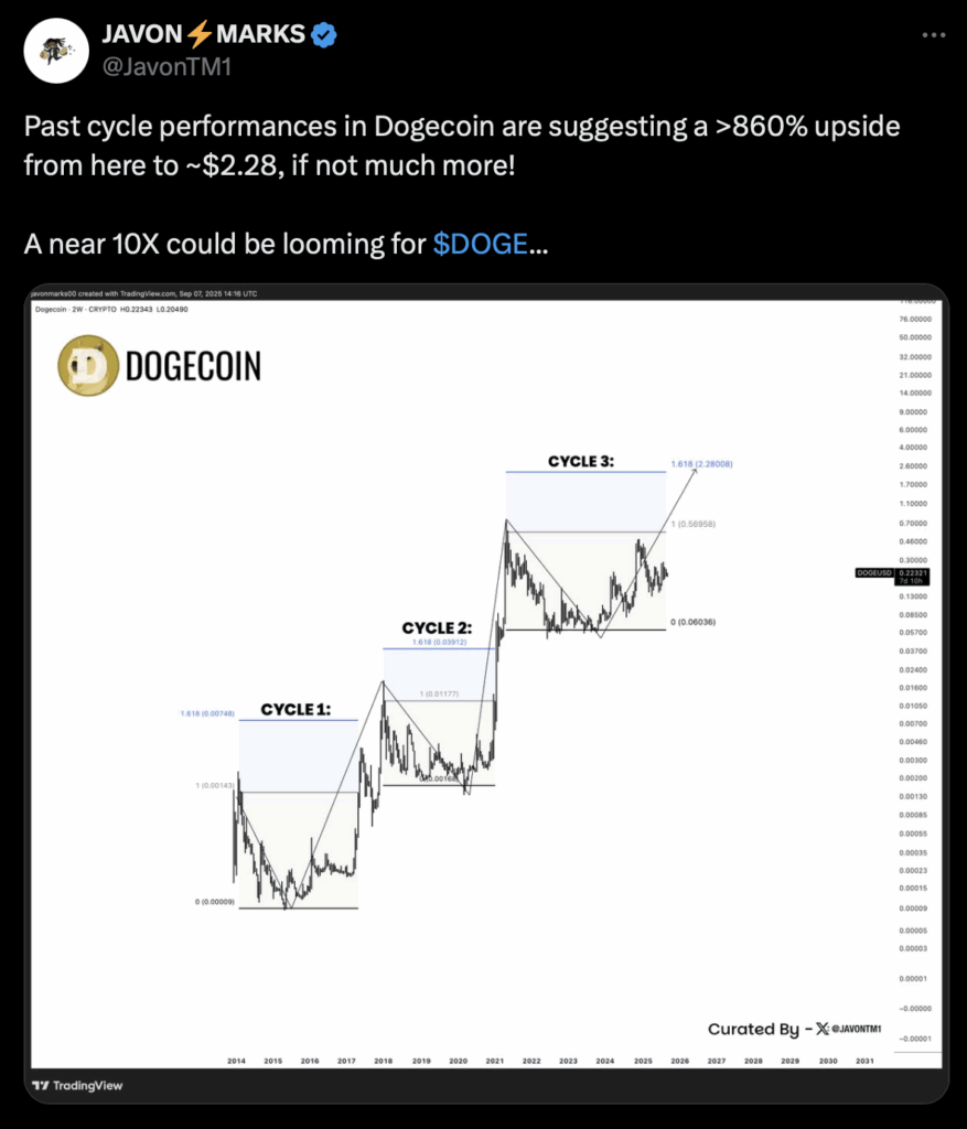 - According to Javon, Dogecoin price is setting up for another major cycle move, similar to previous bull markets.