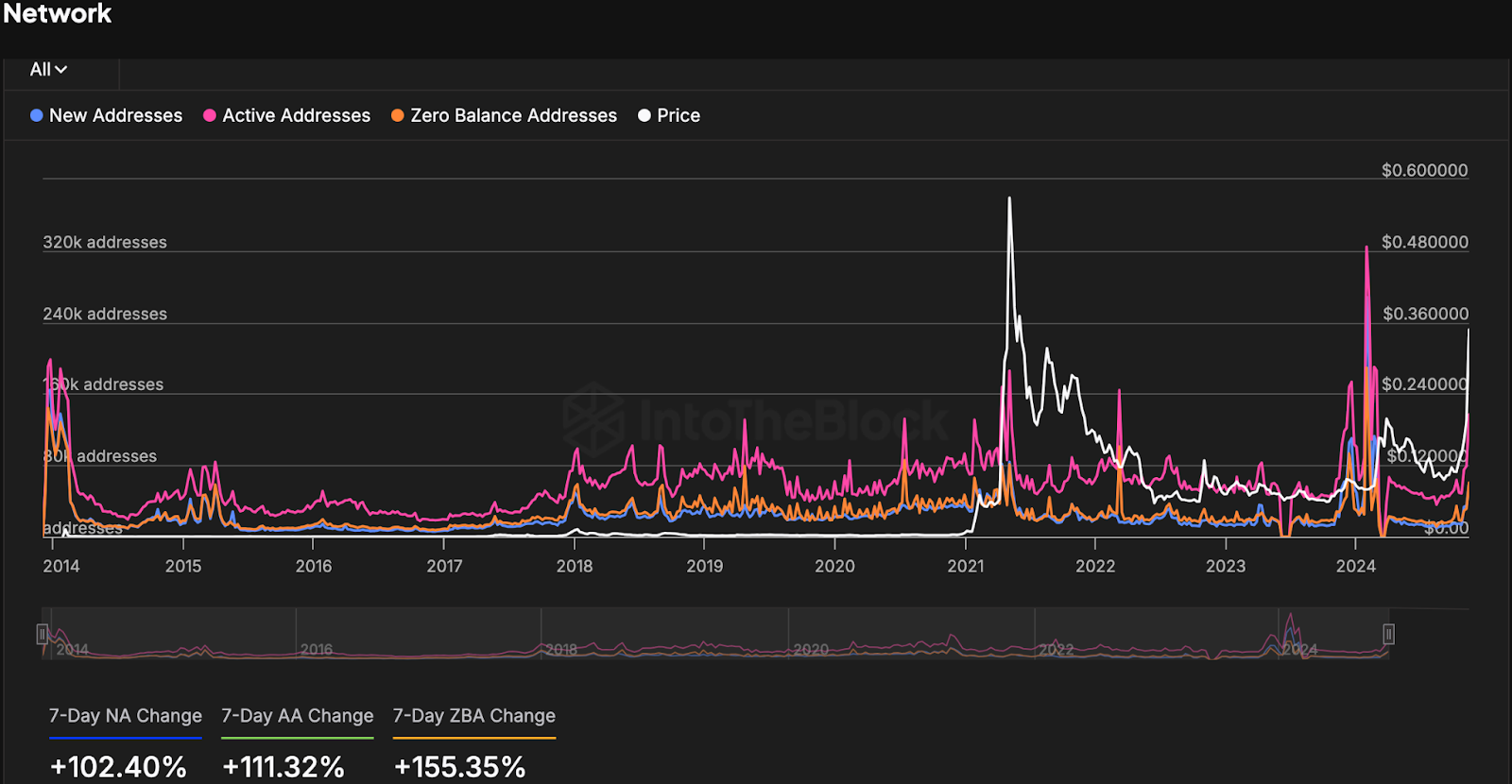 It's important to note that the recent surge in Dogecoin's price is supported by increasing network activity. Data from IntoTheBlock indicates a rise in key indicators such as New Addresses, Active Addresses, and Zero Balance Addresses. In the past seven days, New Addresses have increased by 102.4%, Active Addresses have risen by 111.32%, and Zero Balance Addresses have grown by 155.35%.