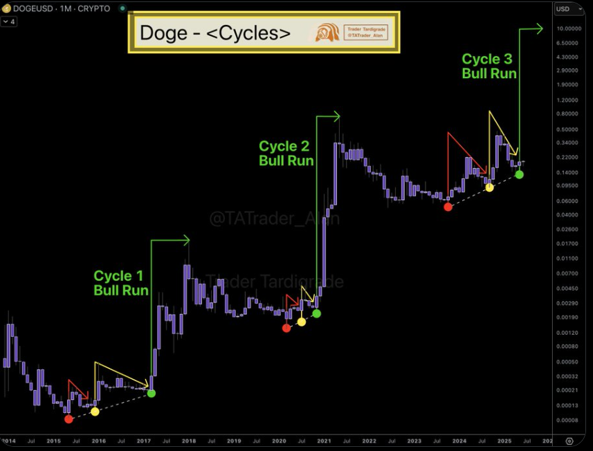 Chart analysis shared by Trader Tardigrade highlights a potential new bullish phase in Dogecoin's price cycles. The monthly DOGE/USD chart reveals a recurring pattern of consolidation followed by periods of rapid price expansion.