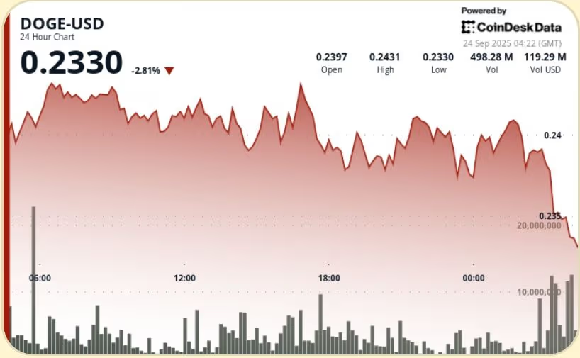 Dogecoin (DOGE), after briefly dipping in volatile sessions, has defended the $0.24 level with volume spiking past 500 million. This activity suggests that traders and retail investors are keeping a close eye on DOGE’s price floor, although sustained bullish momentum has yet to materialize.