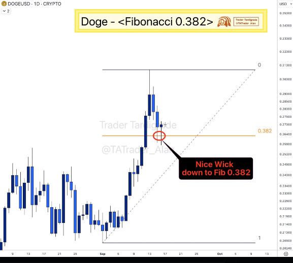 The Fibonacci retracement framework continues to provide important context for Dogecoin’s performance. The defense of the 0.382 level highlights its relevance as a structural pivot. In past cases, sustained closes above this range have allowed for larger recoveries.