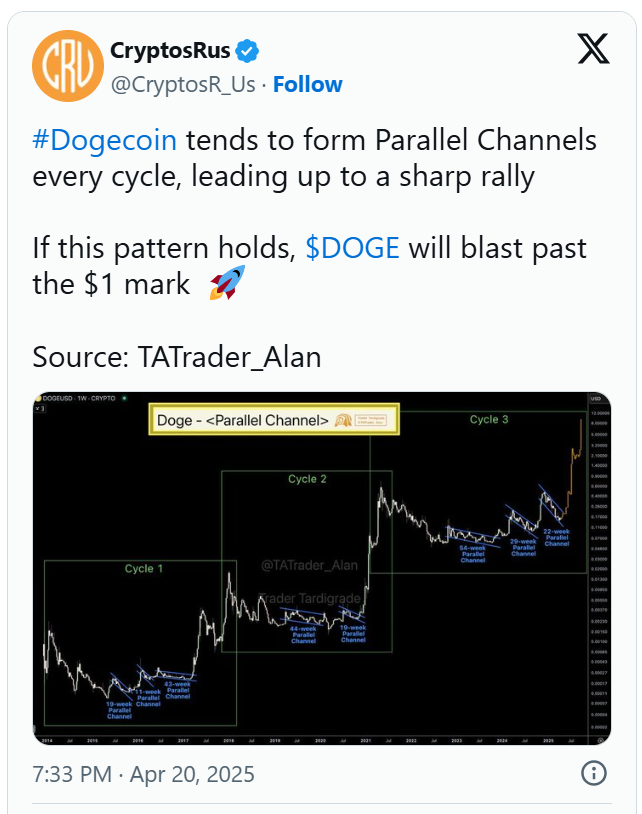 DOGE has experienced three major parallel channels since 2023. The most recent, a pullback from December highs, was the steepest. This analysis suggests these channels could precede a significant upward move.