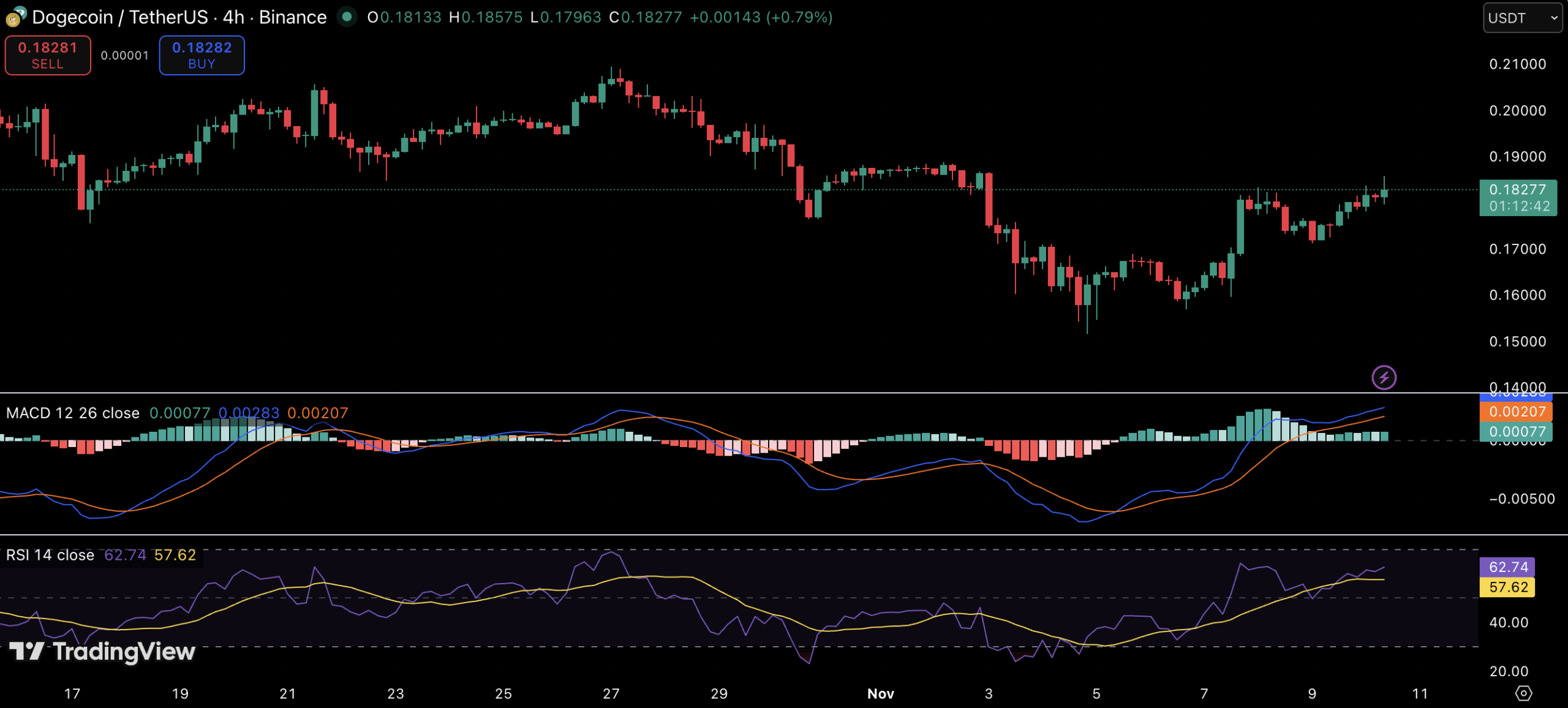 Technically, the latest 4-hour chart from Binance shows encouraging signs of recovery. The MACD lines have turned positive, the histogram is rising, and the RSI continues to trend upward toward the overbought zone. Together, these indicators hint at improving momentum and a potential attempt to reclaim higher levels near $0.19–$0.20.