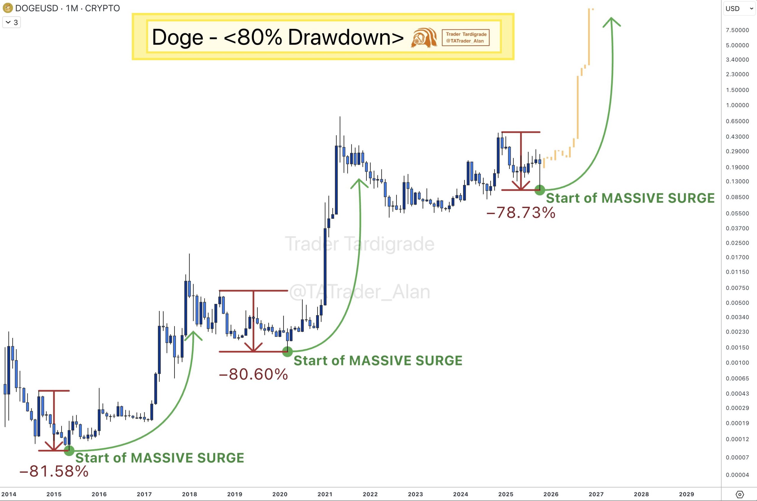 Veteran trader Trader Tardigrade believes the recovery echoes Dogecoin’s past cycle behavior, where deep corrections were often followed by sharp rebounds. “DOGE tends to explode after losing 80% from its highs,” he noted.