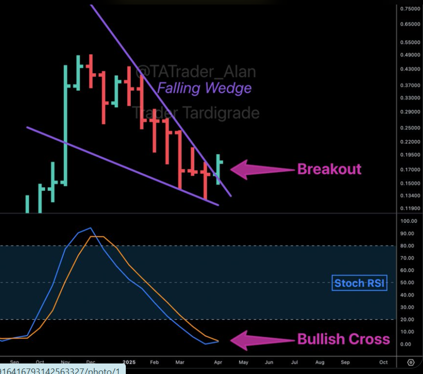 Crypto analyst Trader Tardigrade highlighted Dogecoin's breakout from a falling wedge pattern as a key technical achievement. This breakout, observed in April 2025, is considered a bullish reversal from a downtrend.